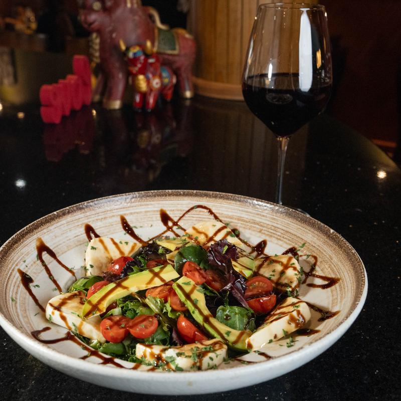 Spring mix topped with cherry tomatoes, mozzarella cheese, avocado, and basil vinaigrette.