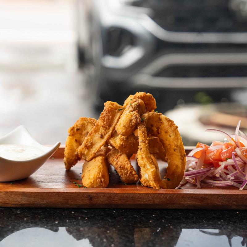 Breaded deep-fried calamari rings served with yuca fries, sarza criolla, and tartar sauce.