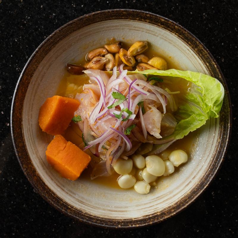 Chopped fish, shrimp, or mixed seafood with red onion and cilantro marinated with fresh lime juice accompanied with sweet potatoes, white corn, and cancha.
