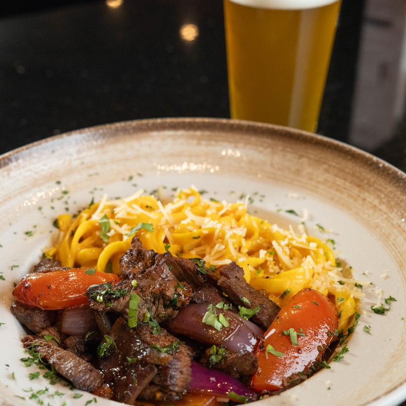 Spaghetti pasta on a creamy yellow pepper sauce served with your choice of Lomo Saltado $29.00 | Chicken Saltado $25.00 | Shrimp Saltado $26.00